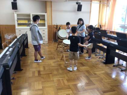 お日様組、にこにこ組、ひだまり組の道徳の授業です。お話の中に太鼓が出てきたので、音楽室にある太鼓をたたく体験をしてい流ということでした。