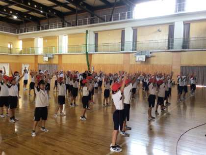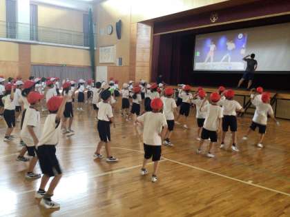 2年生の体育の授業です。動画を見ながら、「怪獣の花唄」という歌で踊っていました。