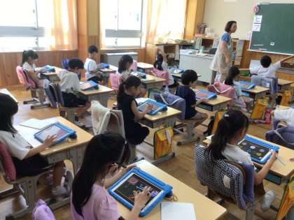 9/4 カタカナ 1年生 公開日 2024/09/04 更新日 2024/09/04 各学年から 1年生の国語の授業です。学習用タブレットを使って、カタカナの練習をしていました。タブレット上で、指でなぞって何度も練習できます。タブレットの電源を切って、キャビネットにしまうのも、スムーズにできました。 3枚目の写真は、廊下の掲示です。教室の入り口など、よく目につくところに掲示してあります。 1年