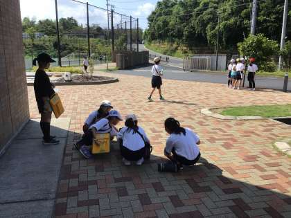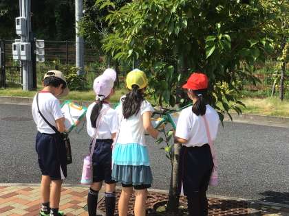 4年生の理科の授業です。学校の木を観察していました。春の頃と比べて、夏の終わりの様子はどう違うのかを見つけていました。