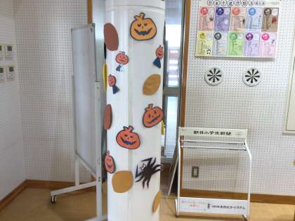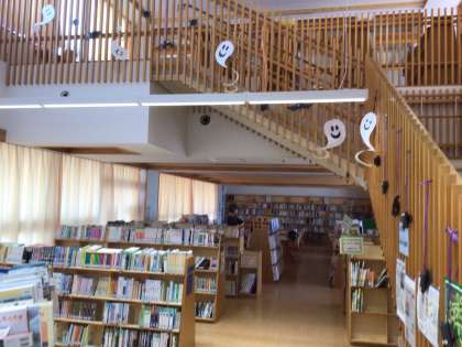 図書館ボランティアの方々が、秋の掲示をしてくださいました。ハロウィンやきのこなどの楽しい掲示ができあがりました。図書館内の階段にもお化けが登場。
