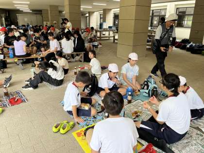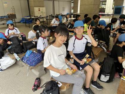 9/13 キャンプ 昼食 公開日 2024/09/13 更新日 2024/09/13 各学年から 予定していた12時には、「いただきます。」が出来ました。お昼ご飯は野外センターのどんぐり食堂のお弁当です。「美味しい」と子どもたちにも好評でした。 天気は曇っていて、今の気温は30度ほど。浄水北の気温と比べて、大体2度くらい低いようです。 5年 行事
