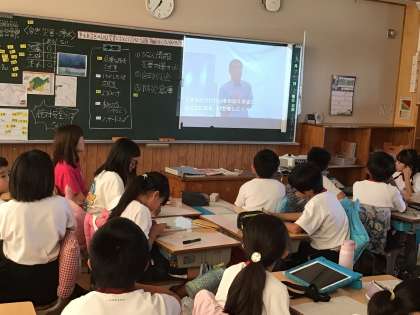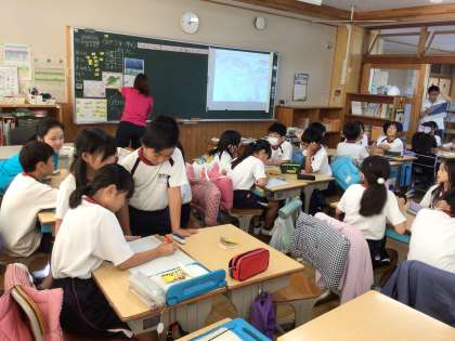 4年生の社会科の授業です。子どもたちがより身近なこととして考えられるよう、地域の防災対策について、区長さんへのインタビューを事前に担任が行っていました。子どもたちはグループで予想を話し合った上で、インタビューを聞きました。真剣に話を聞いていました。授業を見に来てくださった副区長さんからも、最後にお言葉をいただきました。