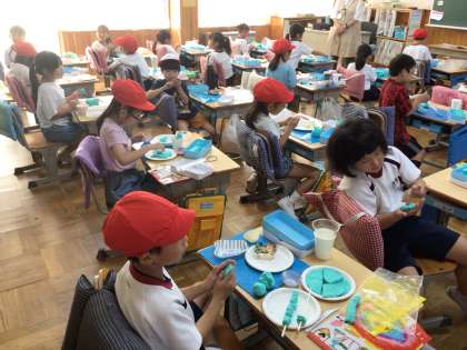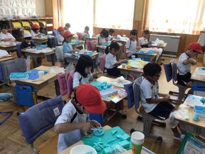 1年生の図工の授業です。粘土でごちそうを作っていました。細かく伸ばして麺を作ったり、丸めてお団子にした物を串に刺したり。「ラーメンを作っているの。」「これはハンバーグだよ。」と教えてくれました。