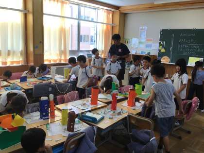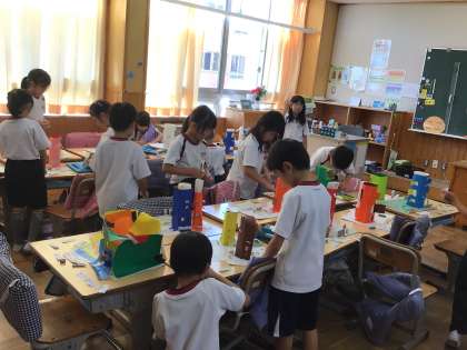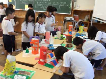 2年生の図工の授業です。「窓からこんにちは」の作品が完成したので、鑑賞会をしていました。互いの作品を見合って、良いところをメモしていました。