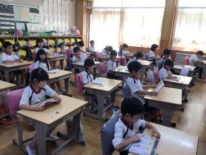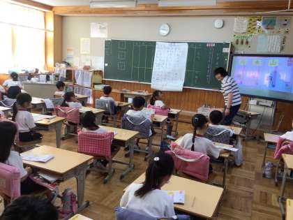 1年生の国語の授業です。「靴は1足」「本は1冊」などの数え方を学習したあとは、新しい漢字を習いました。
