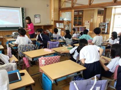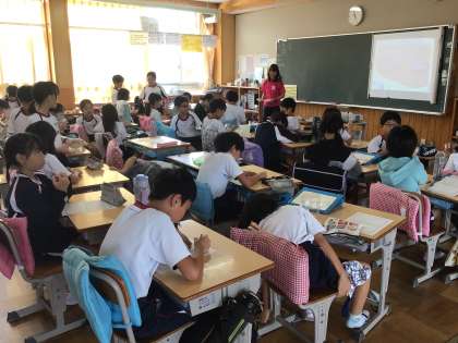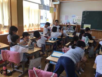 4年生の理科の授業です。水が空気中に出ていくのか、水を入れた入れ物を使って調べる実験の準備をしていました。蓋をする、しない場合で比較していきます。