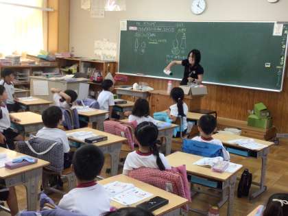 1年生の算数の授業です。形の違う容器に入る水の量を、どのように比べたらよいか考え、発表していました。