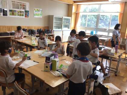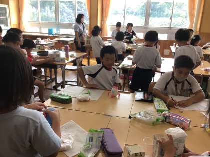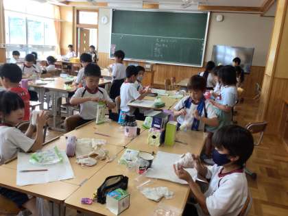 3年生の図工の授業です。ペットボトルや牛乳パックを土台にして、紙粘土をよく練って貼っていました。