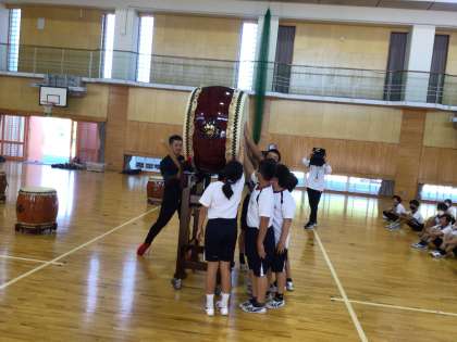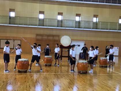 様々な太鼓を見せていただき、音を聞かせていただきました。大きな平胴太鼓を子どもたちが触り、反対側から講師の方が叩くと、音と振動の迫力に、思わず声をあげていました。子どもたちに貴重な体験をさせてくださった、松平和太鼓と文化振興財団の皆様、ありがとうございました。