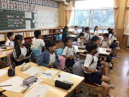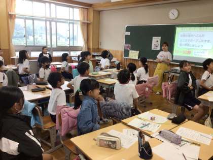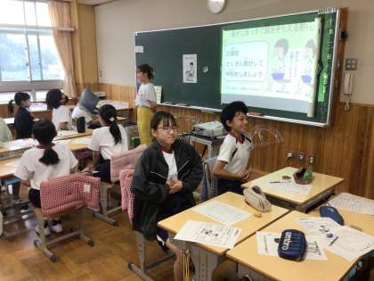 5年生の保健体育の授業です。養護教諭から、姿勢を良くするとどんな良いことがあるかを教えてもらった後、姿勢を良くするためのトレーニングをしていました。