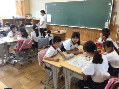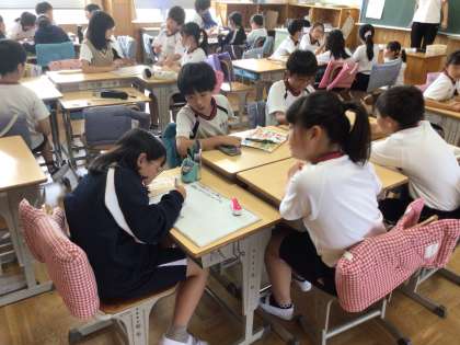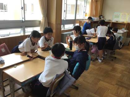 4年生の理科の授業です。土の中に水分があるか調べる実験を前に、グループで予想をしてホワイトボードに書き込んでいました。