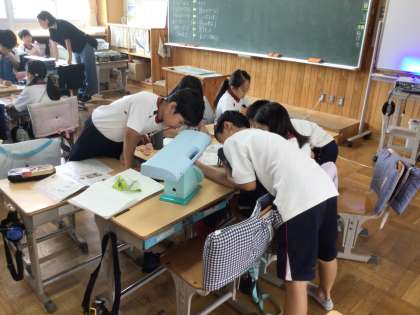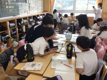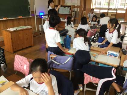 3年生の算数の授業です。はかりを使って、身の回りの物を測定する活動を、グループで行っていました。