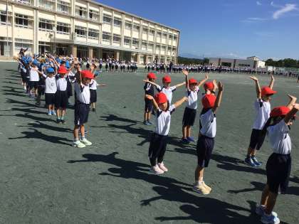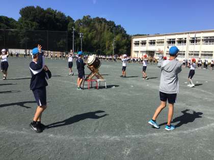 運動会の全校練習で、浄水音頭の練習をしました。6年生の太鼓と踊り隊の子どもが真ん中に入り、それを囲むように全校で輪になって踊ります。当日は、地域の方や保護者に入っていただき、みんなで楽しく踊ります。