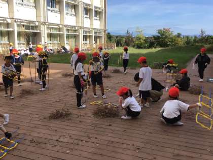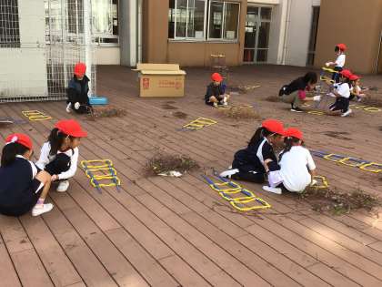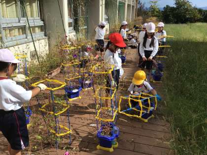 1年生の生活科の授業です。種を取り終わったあさがおの蔓を集め、リースを作る準備をしていました。あさがおの一生を見届け、ありがとうの気持ちで片付けをします。