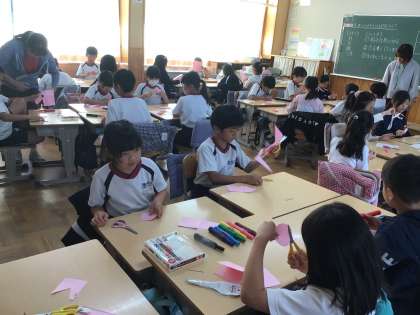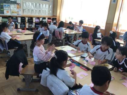 3年生の算数の授業です。コマを作って点を書き入れ、回した時にどんな模様になるか、予想をしてから回して確かめていました。