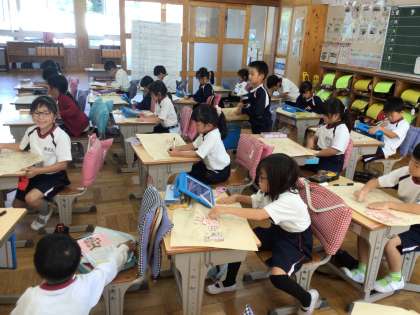 1年生の図工の授業です。「海へ行った小さなカニカニ」というお話を読んで、心に残った場面の絵を描きました。カニは別の紙に書き、切り取って絵の中に置きました。