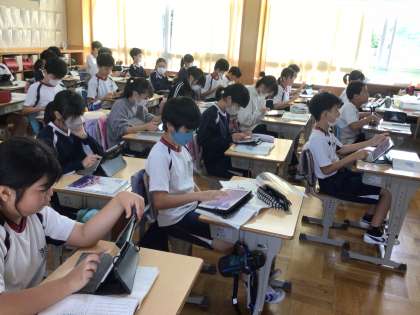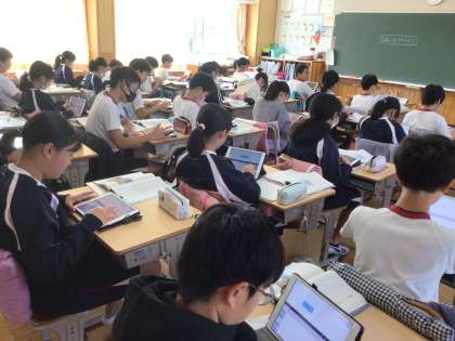6年生の国語の授業です。「永遠のゴミ プラスチック」という説明文を読んで段落ごとにまとめ、マインドマップに整理していきました。