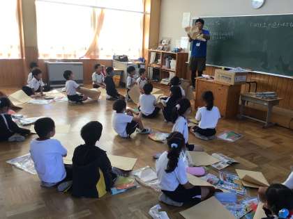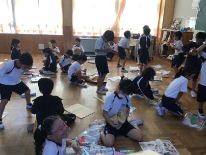 2年生の図工の授業です。丈夫な紙の袋を手で揉んで柔らかくして作品を作っていきます。まずは紙をくしゃくしゃにするのを、全力で楽しんでいました。