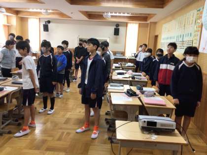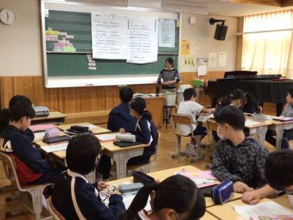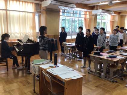 6年生の音楽の授業です。楽譜を拡大した物を見ながら、「この部分はこんな感じで」「ここから盛り上げて」などと歌い方について話し合いました。そして、それを見ながら歌っていました。