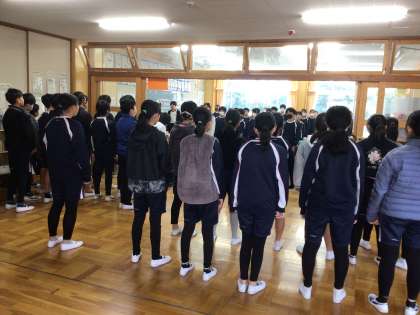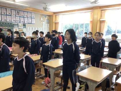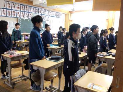 朝の会の時間に朝の歌を歌っています。6年生はこの時間に、合唱の練習を他クラスともしていました。美しい声が響き合っていました。