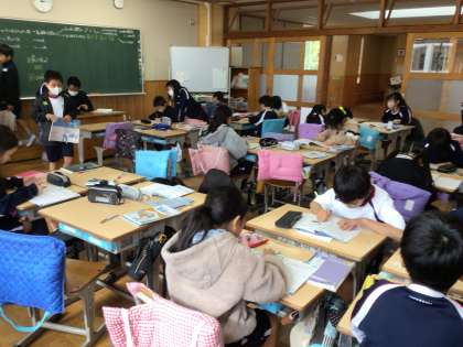 4年生の算数の授業です。算数の友の問題を進めていました。自分で考えて分からないときには、グループの子や先生にヒントを出してもらったり、教えてもらったりしていました。