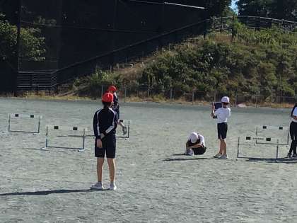 5年生の体育の授業です。ハードル走の練習をしていました。ハードルをとび越す様子を学習用タブレットで撮影をし、見直したり、アドバイスをし合ったりしていました。
