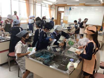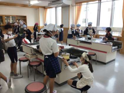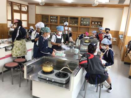 5年生の家庭科の授業です。鍋でご飯を炊いていました。お鍋が透明なので、中の様子がよく分かります。火加減に気をつけていました。美味しいご飯が食べられそうです。
