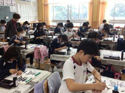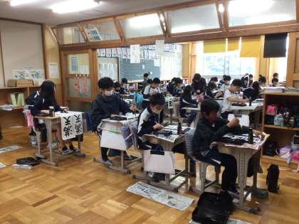 6年生の書写の授業です。書き初めの練習をしていました。学習用タブレットでお手本動画を確認して、気をつけることを意識しながら練習していました。