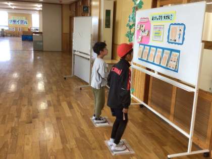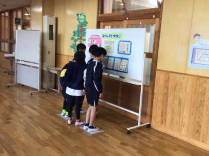 保健室前の掲示は、月の保健目標に合わせてかえています。姿勢チェックの掲示を見て、子どもたちがセルフチェックをしていました。