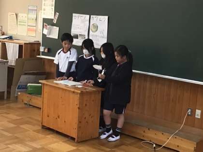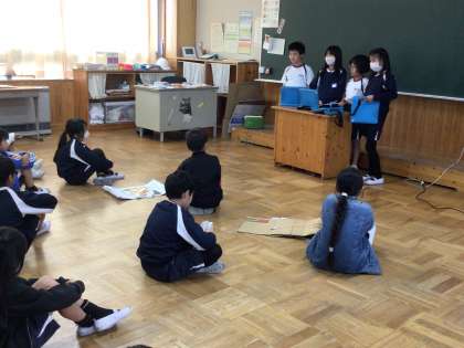 4年生の総合的な学習の時間です。グループごとに発表し、アドバイスをしあいました。発表の内容や方法をさらに良くしていきます。