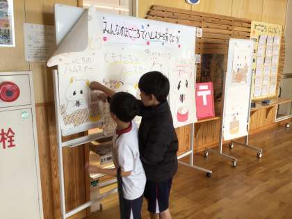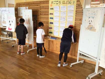 まごころ委員会のキャンペーンで、まごころカードを書こうという意識が高まっています。カードを書くと、ハムスターのところに「ひまわりの種シール」を貼れます。