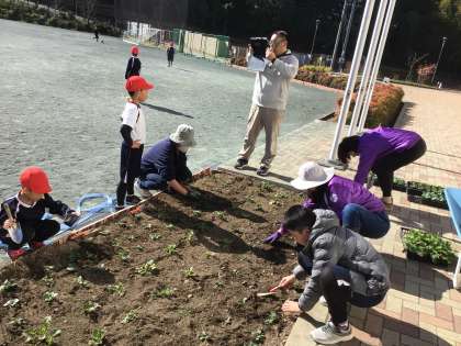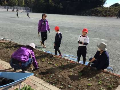 なかよしタイムに、花壇ボランティアの方と一緒に、子どもも苗を植えました。ビオラの苗です。きれいに花を咲かせる日が楽しみです。花壇ボランティアの皆様、ありがとうございました。