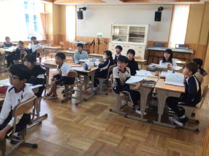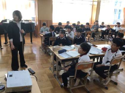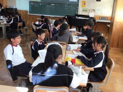 4年生の音楽の授業です。フルートで演奏された2つの曲について、息の入れ方や音の高さ、リズムなどを聴き比べ、グループで交流をしていました。