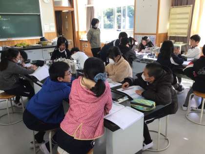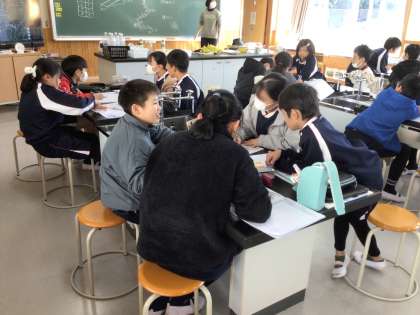 5年生の理科の授業です。流れる水の働きのよって、川のどちら側の土がたくさん削られるかを考え、グループで話し合いました。