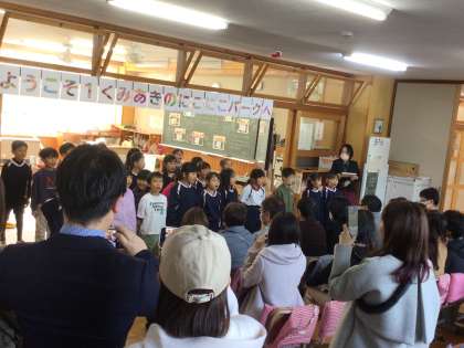 1年生のテーマは「ようこそ!あきのテーマパークへ」。まごころの森で見つけた秋の「すてき」を使って作った物を紹介したり、一緒に遊んだりしました。