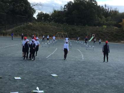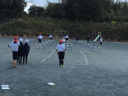 5年生の体育の授業です。ハードル走の練習をしていました。今日は4つのハードルを縦に並べ、リズムよく跳んでいく練習でした。