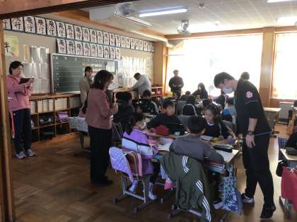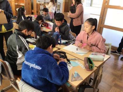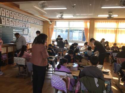 5年生の算数の授業です。折り紙から出てきた形を調べ、「多角形」という言葉を習いました。これからの学習の計画も立てました。研究授業でたくさん参観者がありました。