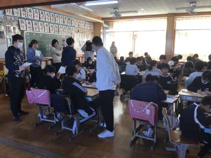 5年生の算数の授業です。円を使って正方形をかく方法を考えました。グループでまとめてホワイトボードに書き、それをもとに全体で話し合いました。研究授業でした。