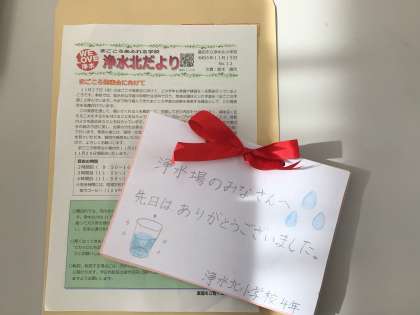 4年生が見学のお礼の手紙をまとめた物を、担任が浄水場へ届ける準備をしていました。個々の手紙を見せてもらうと、丁寧に心を込めて書いていました。見学で実際に見たり説明を聞いたりしてわかったことが具体的に書いてあり、実感を伴ったよい学習ができたことが伝わってきました。水をきれいにしてくださっていることや丁寧に対応してくださったことのお礼もしっかり書いてあり、実際に触れ合うことで心も育つことを実感しました。