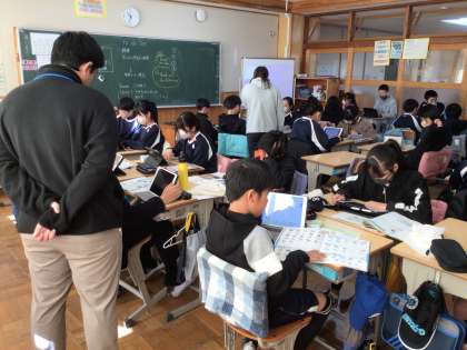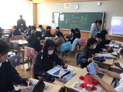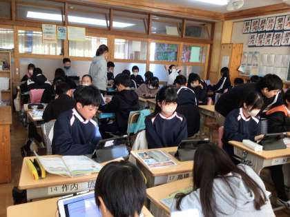 6年生の外国語の授業です。生き物のために身近でできることについてスピーチを考え、グループで発表をしあいました。スピーチを聞いて思ったことや良かったことを発表ノートに書き込み、交流していました。