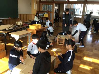 3年生の図工の授業です。ダンボールに切れ込みを入れ、それを組み合わせて作品を作ります。そのために、ダンボールカッターを使って切れ込みを入れていました。