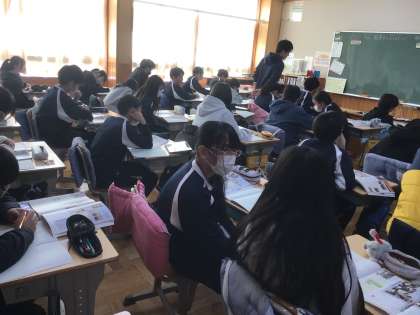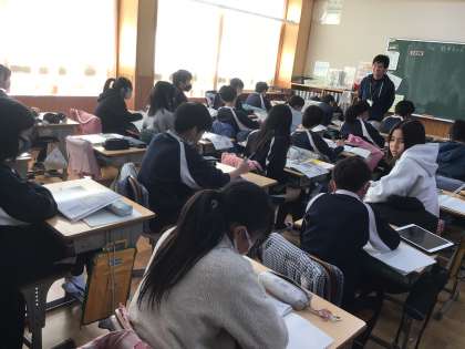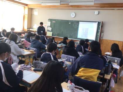 6年生の社会科の授業です。戦争の時の「ぜいたくはできないはずだ!」と書かれた看板の写真を見て思ったことをノートに書いたり、友達と共有したりしていました。