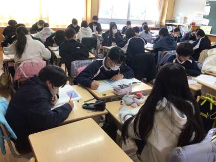 6年生の国語の授業です。「海のいのち」のお話を読んで、クエに会った時の主人公の気持ちを、言葉を手がかりに考え、プリントに書き込んでいました。集中して読み返していました。