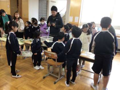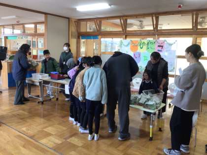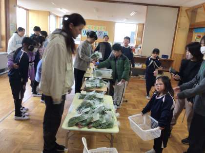 12/13 おひにこ市場 おひにこ 公開日 2024/12/13 更新日 2024/12/13 各学年から お日さま組、にこにこ組、ひだまり組が育てた野菜を売る「おひにこ市場」 今回は、ラディッシュ屋さんでした。取りたての新鮮ラディッシュにカードをつけて袋に入れて準備をした物を販売しました。お客さん(先生)を呼び込んだり、やり取りをしたり。お金の計算も頑張りました。