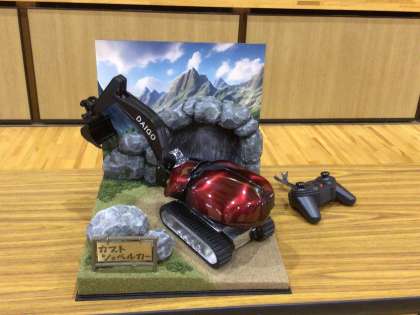 児童の考えた夢の自動車(絵)を、トヨタ自動車開発試作部の皆さんが、3か月かけて、実際に動く模型にしてくださったのです。背景のジオラマも手作りです。