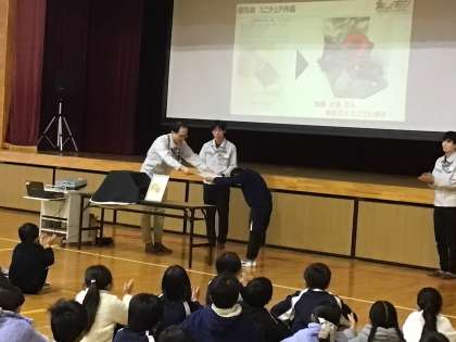 今日の全校集会は、トヨタ自動車の方にお越しいただき、「こども乗り物デザイン展」の表彰とお披露目をしていただきました。「こども乗り物デザイン展」に応募のあった約4,500の作品の中から、本校の児童の作品が選ばれました。(全部で7作品が選ばれたそうです)