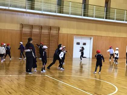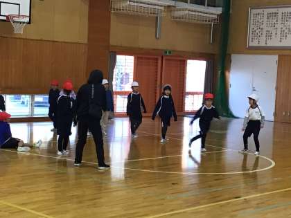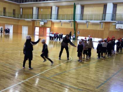 1年生が3クラス合同で体育を行っていました。長縄跳びの練習です。タイミングを合わせて入れるよう、声をかけたり、背中をたたいて合図をしたりしていました。