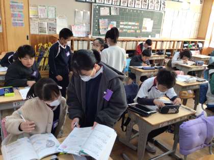 5年生の算数の授業です。習ったところの復習のために、算数の友の問題に取り組んでいました。よく分からないところは友達に聞いて、真剣に取り組んでいました。
