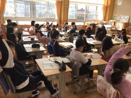 3年生の国語の授業です。「モチモチの木」の豆太が、「じさま」と言った時の気持ちについて話し合っていました。話している人の方に体の向きを変えて、しっかり話を聞くことができていて、感心しました。
